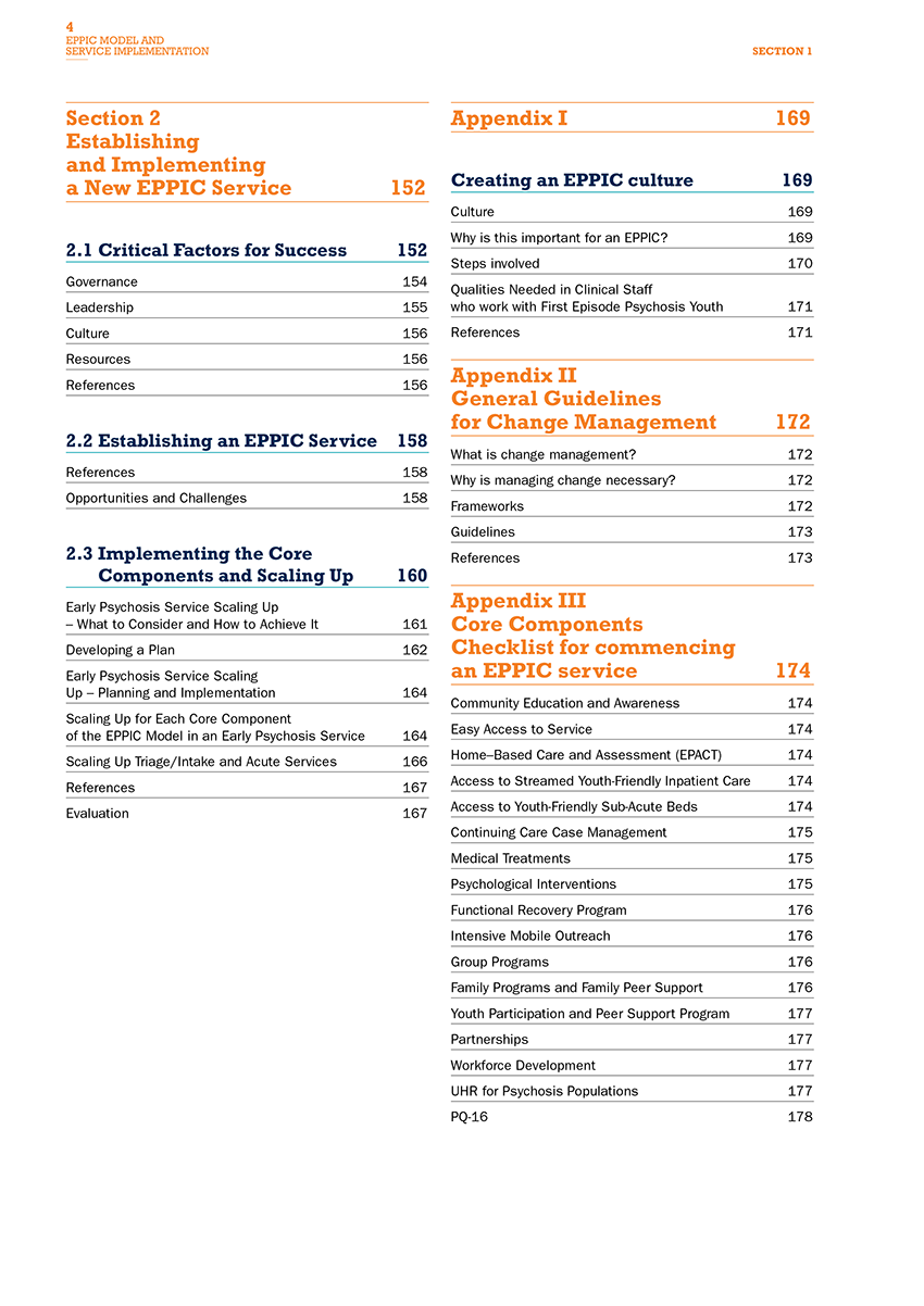 There is a section on scaling up of services, as this can be one option to assist after initial implementation.Clear detail is provided of all of the EPPIC standards, and these are divided into three groups. The first of these are the minimum essential or ‘given’ standards that will occur when implementing the model with the core components. The next are the secondary standards that need to be achieved, and the third are the guidelines that also incorporate the Australian Clinical Guidelines for Early Psychosis (2nd edition). By services taking note of and achieving these standards, fidelity to the model should be reached.