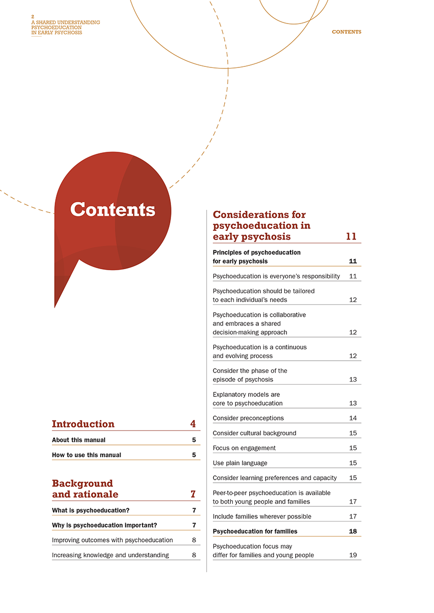 This manual is intended to be a practical guide to psychoeducation interventions for clinicians working with young people and their families in early psychosis services.