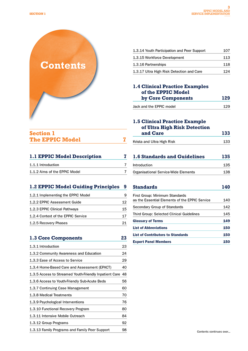 There is a section on scaling up of services, as this can be one option to assist after initial implementation.Clear detail is provided of all of the EPPIC standards, and these are divided into three groups. The first of these are the minimum essential or ‘given’ standards that will occur when implementing the model with the core components. The next are the secondary standards that need to be achieved, and the third are the guidelines that also incorporate the Australian Clinical Guidelines for Early Psychosis (2nd edition). By services taking note of and achieving these standards, fidelity to the model should be reached.