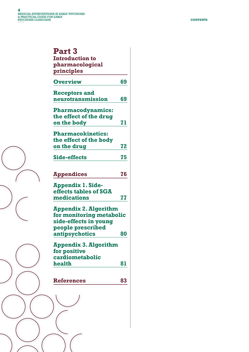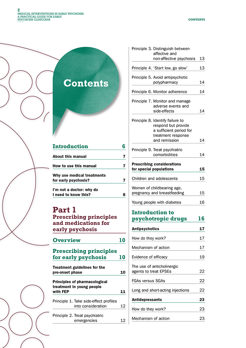 The manual covers: principles for prescribing medication in young people who present with early psychosis; an introduction to the four main classes of psychotropic drugs prescribed in this population; approaches to managing medication in young people, including the role clinicians play in this and strategies for addressing some of the challenges that may arise; and basic pharmacology that may be useful for clinicians’ understanding of how medications are processed by the body.