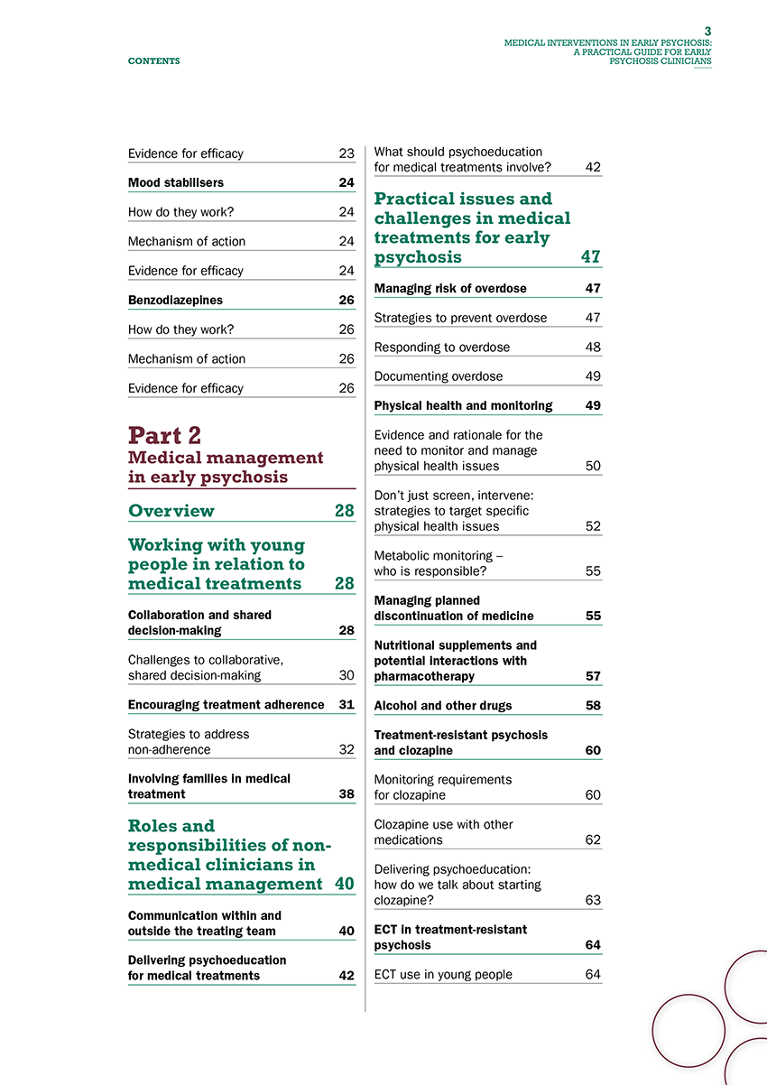 Although not responsible for prescribing medications, non-medical clinicians nevertheless need to have a practical knowledge of medical interventions for early psychosis. This manual has been developed to support non-medically trained clinicians (primarily allied health and nursing professionals) gain a working knowledge of medical interventions for early psychosis.