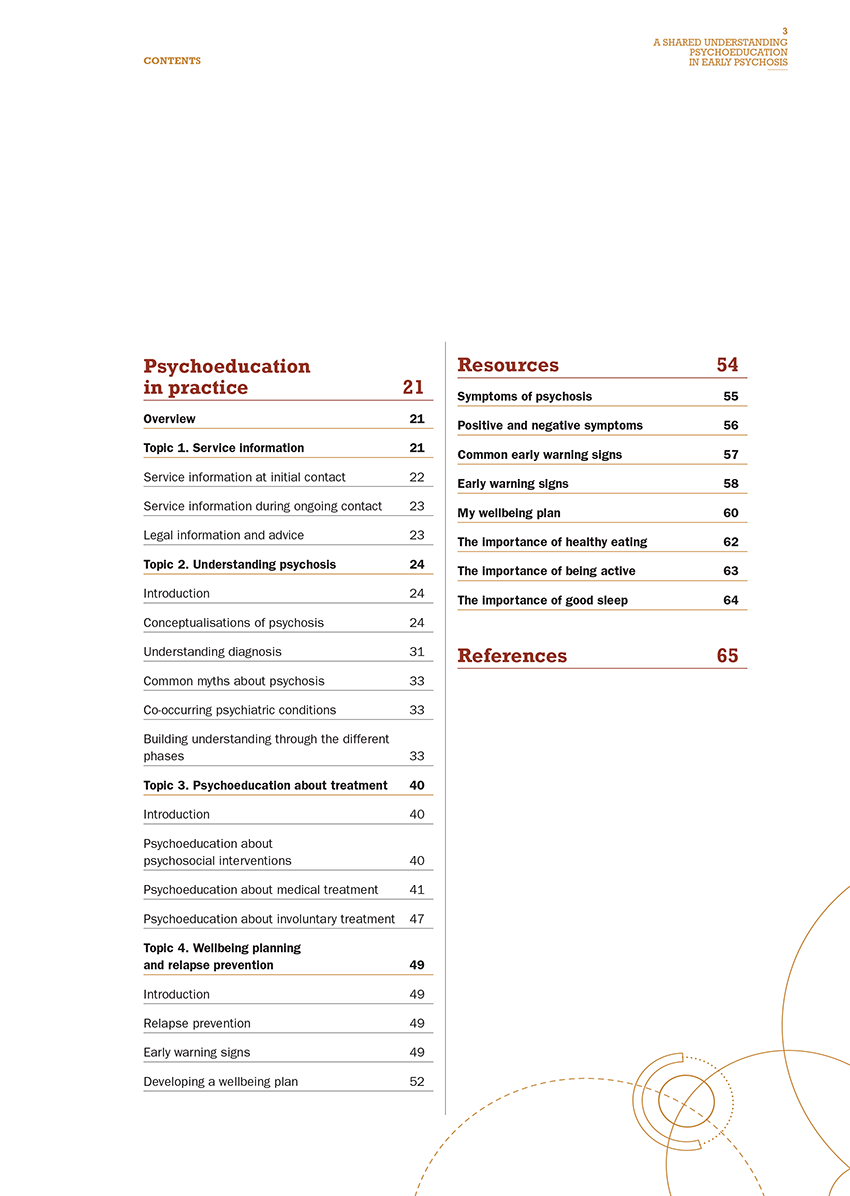 This manual is intended to be a practical guide to psychoeducation interventions for clinicians working with young people and their families in early psychosis services.