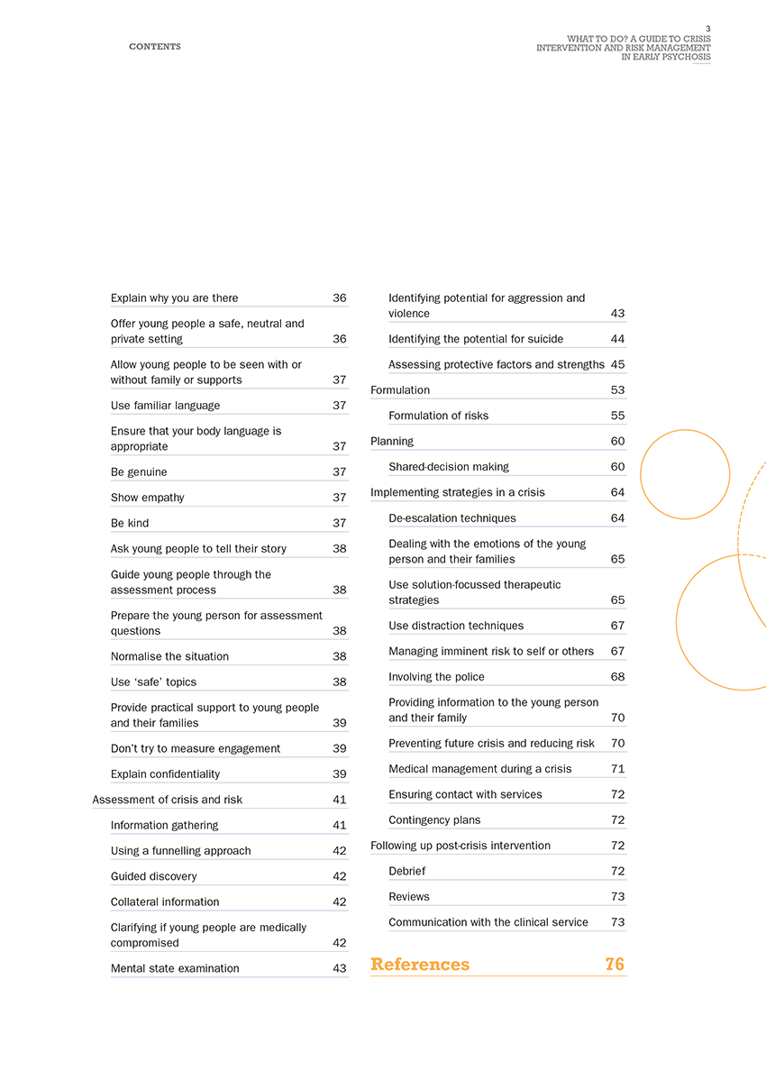 A first episode of psychosis frequently presents as a crisis for a young person and their family, as it is a period often accompanied by emotional distress and impaired functioning. Crises can be overwhelming experiences for young people and their families and often leave individuals feeling vulnerable, isolated and misunderstood. As crises can often be the initial contact with, or entry to, a service they provide a pivotal opportunity to engage young people and their families. Effectively intervening during a crisis may prevent the delay of necessary interventions, reduce hospitalisation, trauma, severity and duration of signs and symptoms, and promote rapid recovery while preserving social supports.